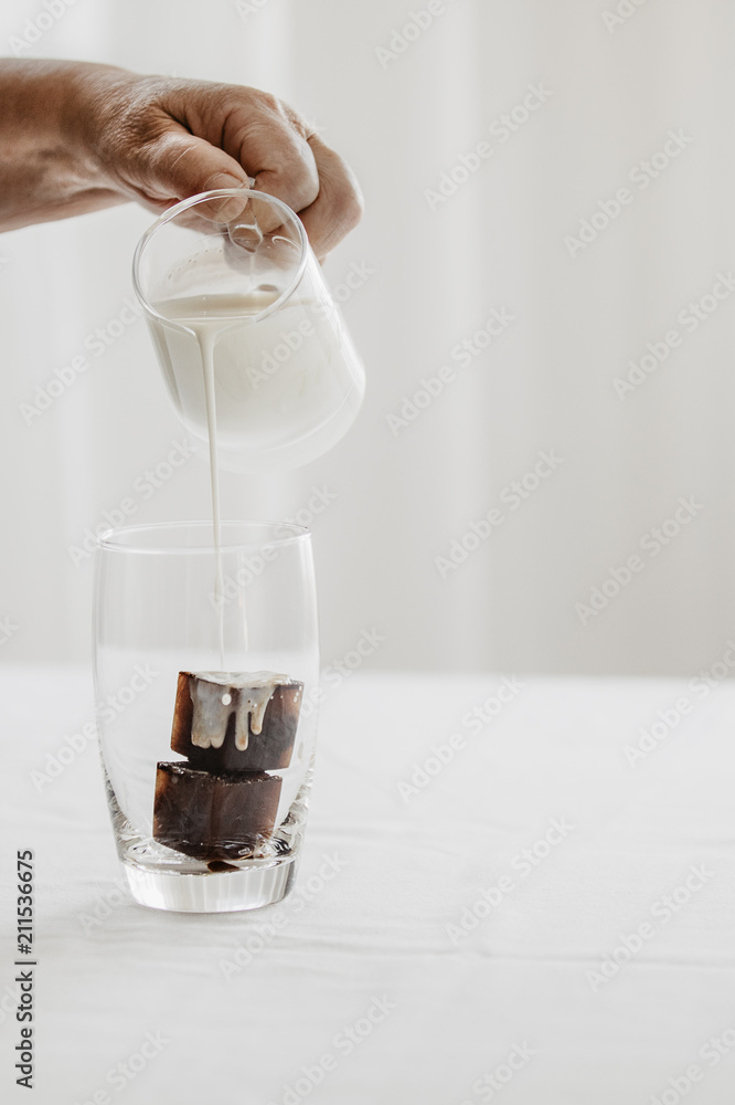 Woman Preparing Iced Coffee Frozen Coffee Ice Cubes In A Glass Poured With Milk To Make A Refreshing Summer Drink White Background Body Parts Stock Photo Adobe Stock